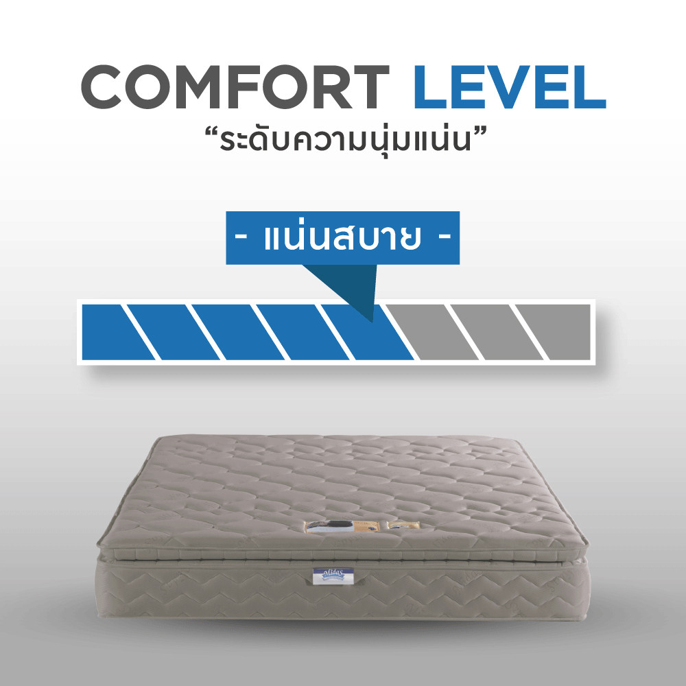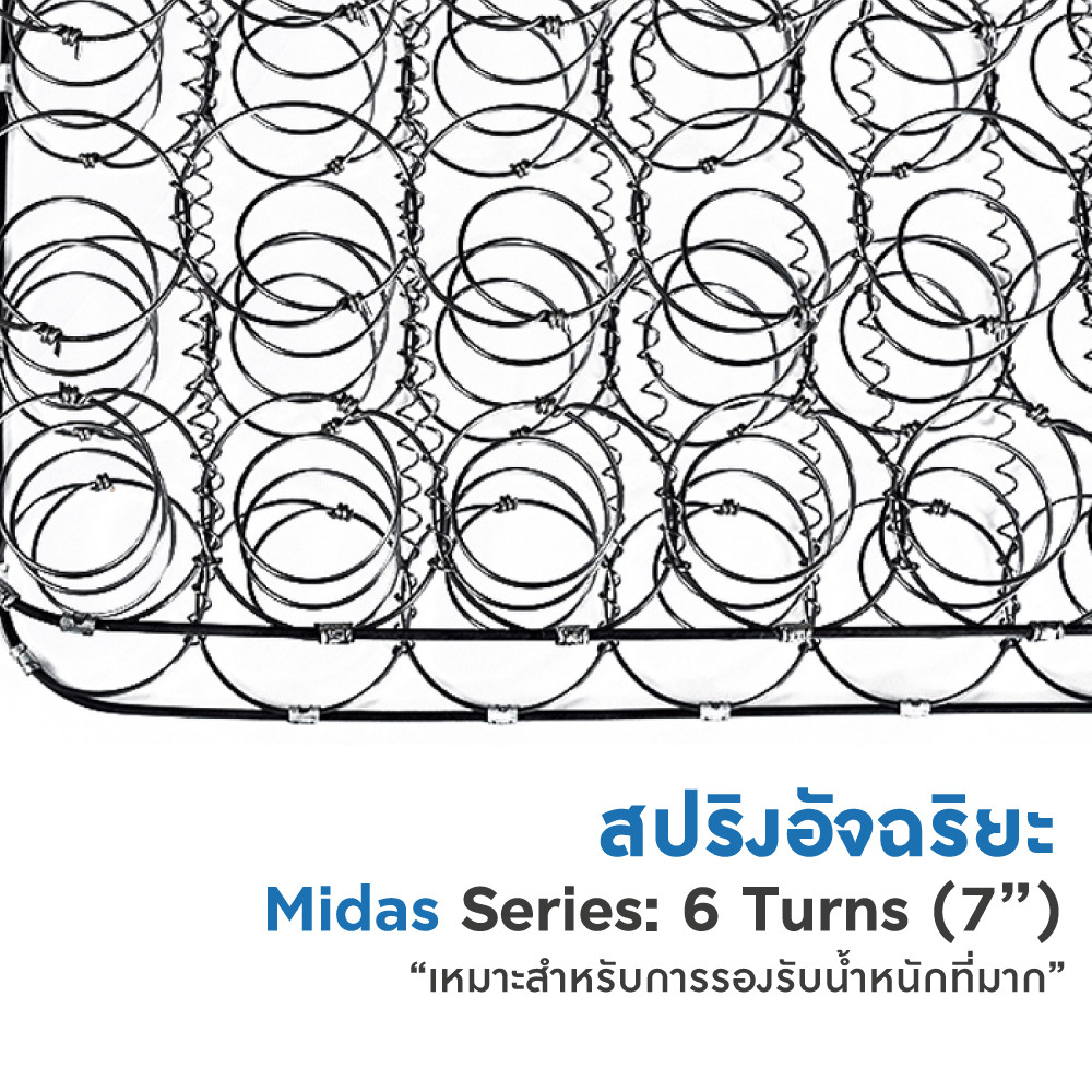 - สปริงอัจฉริยะ Midas Series: 6 Turns (7 นิ้ว) แน่นพิเศษ เหมาะสำหรับการรองรับน้ำหนักที่มากและยังปรับสมดุลแรงกดทับอย่างลงตัว