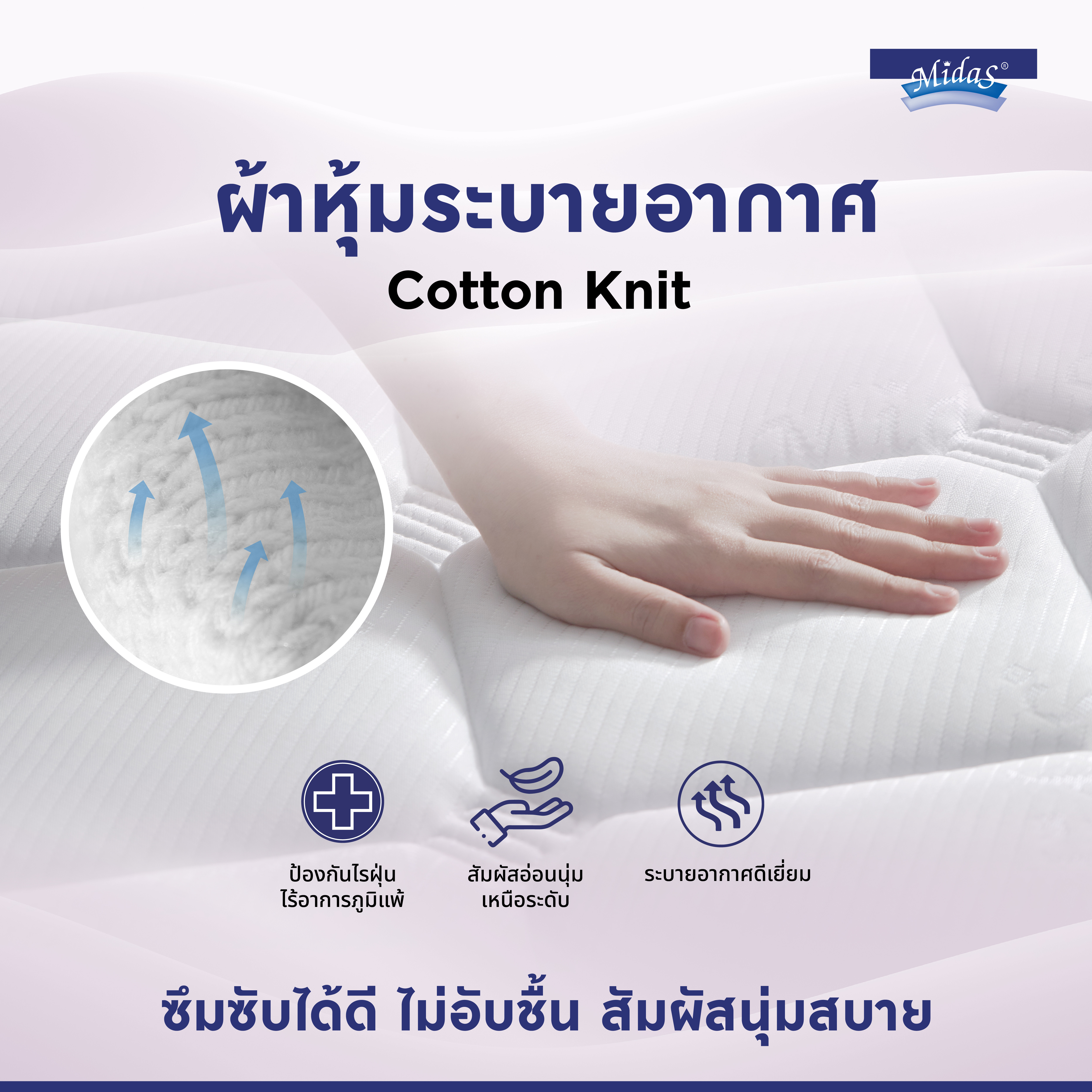 - ผ้าหุ้มระบายอากาศ Cotton Knit ช่วยเสริมให้อากาศผ่านถ่ายเทได้เต็มประสิทธิภาพ ซึมซับได้ดีและแห้งไว ผิวสัมผัสนุ่มนวล ไม่ก่อให้เกิดอาการแพ้หรือระคายเคือง
