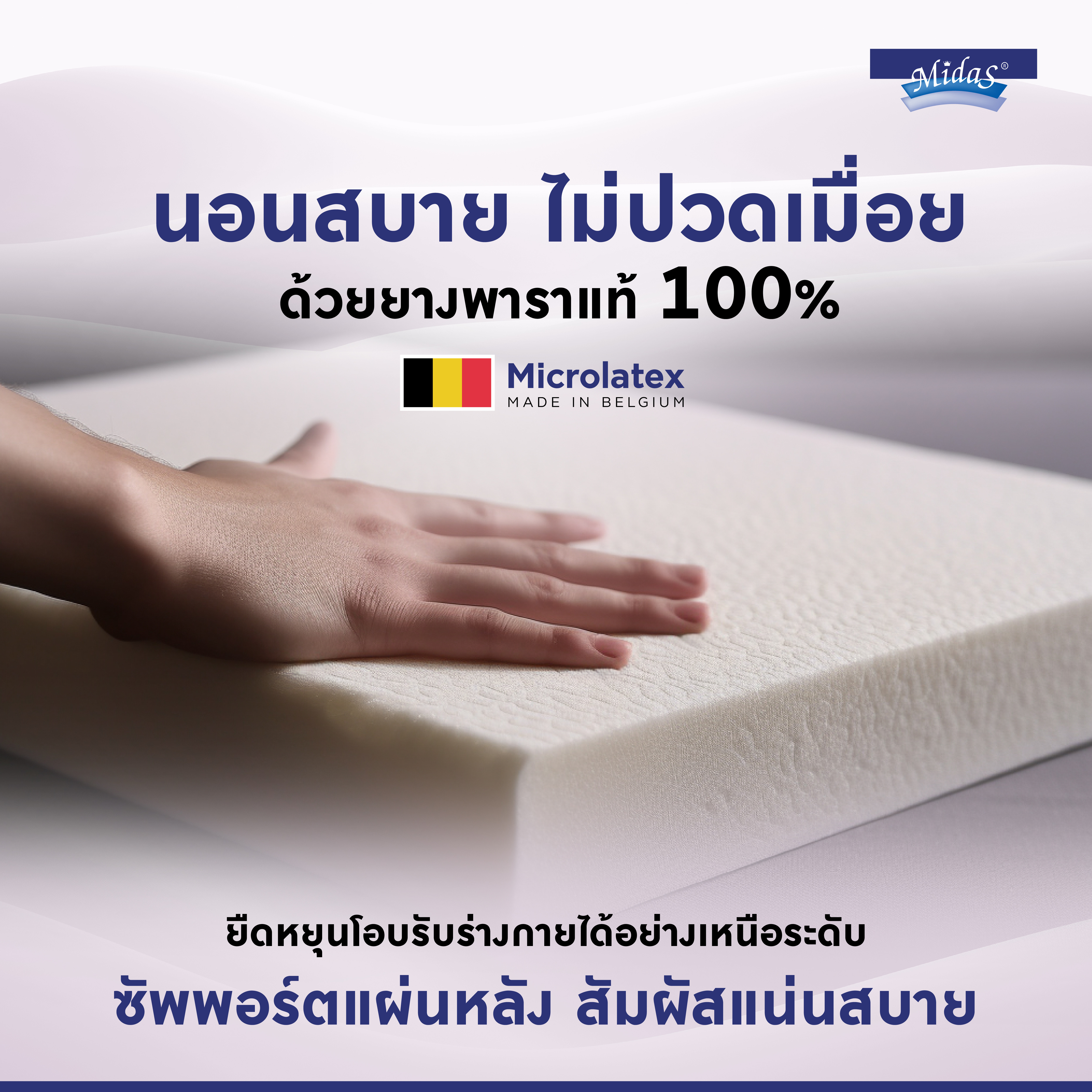 - Microlatex ยางพาราธรรมชาติ 100% นำเข้าจากเบลเยี่ยม ปราศจากไรฝุ่น แบคทีเรียและสารเคมีตกค้าง อีกทั้งมีความยืดหยุ่นสูง. อากาศจึงถ่ายเทได้สะดวกให้ความรู้สึกเย็นอย่างมีประสิทธิภาพช่วยสลายความร้อนสะสมจากร่างการที่ถ่ายเทลงไปสู่ที่นอน การการะจายน้ำหนักเพื่อสลายแรงกดทับของสรีระดีเยี่ยม เพิ่มความสะดวกของการไหลเวียนของโลหิตจึงทำให้ไม่เกิดอาการเหน็บชาหรือพลิกตัวไปมาขณะเวลาพักผ่อนบนที่นอน