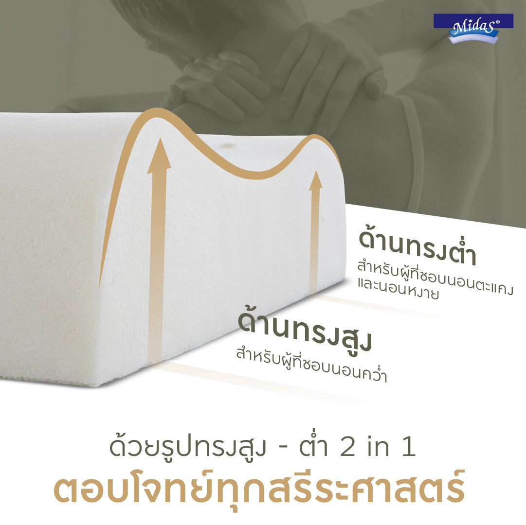 หมอนหนุนยางพารา MIDAS Neck Contour ตอบโจทย์ทุกความสบาย มอบความผ่อนคลายเฉพาะตัว ด้วยดีไซน์รูปทรงหมอนที่มีความสูง-ต่ำแตกต่างกันในแต่ละด้าน หลับสบายทุกท่านอน รองรับส่วนโค้งเว้าของรูปลำคอได้สมบูรณ์แบบพร้อมช่วยสลายแรงกดทับได้อย่างมีประสิทธิภาพ ช่วยแก้ปัญหาอาการนอนกรน และช่วยผ่อนคลายกล้ามเนื้อช่วงศีรษะและลำคอ มอบความสบายให้คุณหลับสนิททุกค่ำคืน