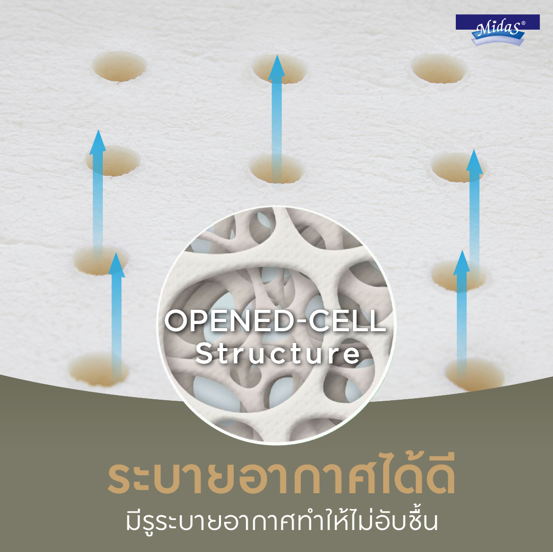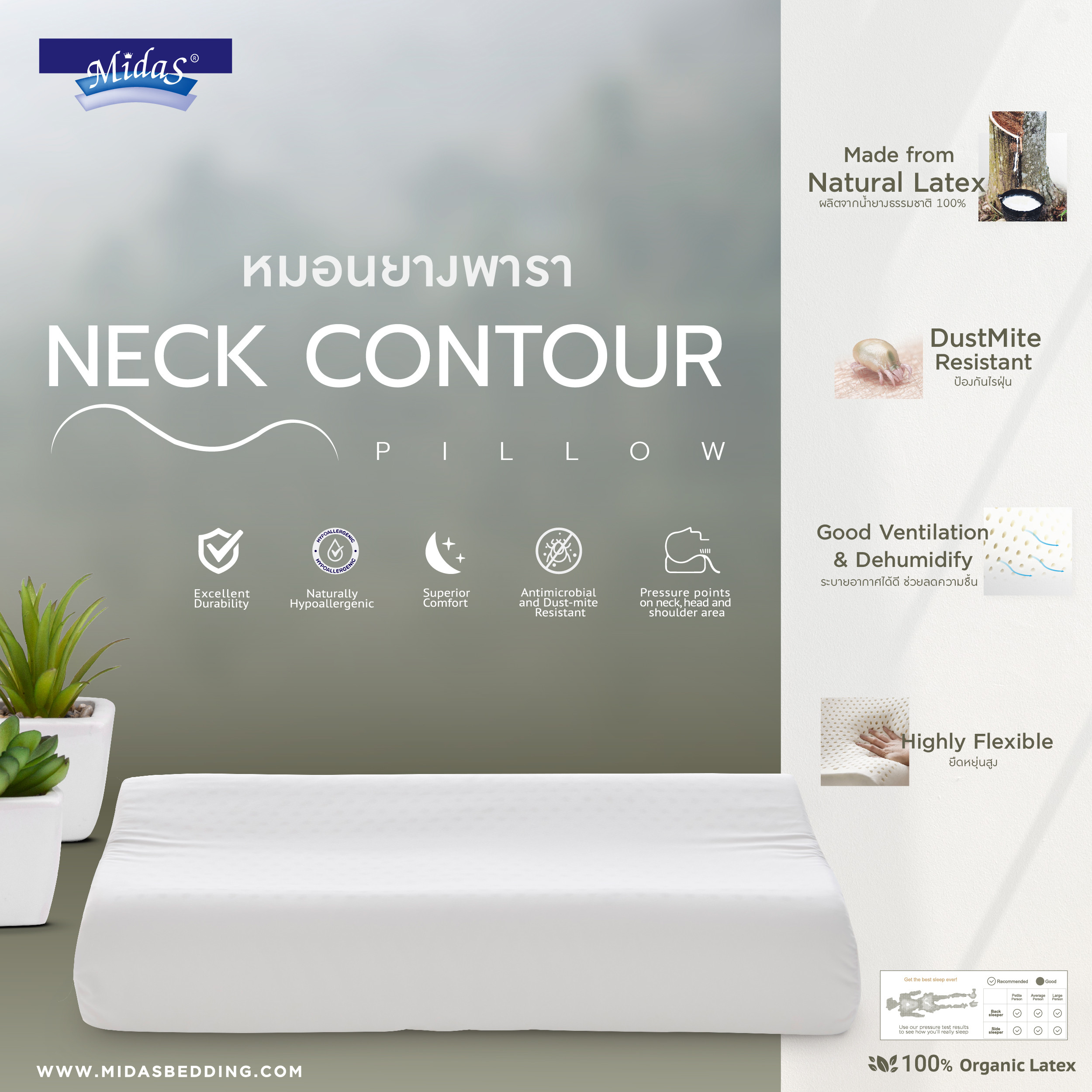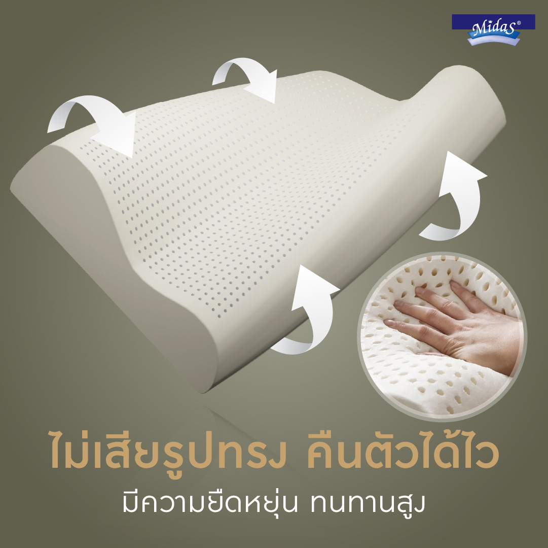 MIDAS Neck Contour ผลิตจากยางพาราแท้ 100% มอบความผ่อนคลายไร้อาการปวดเมื่อยด้วยคุณสมบัติความยืดหยุ่นสูง ช่วยสลายแรงกดทับและคืนตัวอย่างสมดุล ซัพพอร์ตทุกการเคลื่อนไหวให้เคลิ้มหลับง่ายยิ่งขึ้น พร้อมยกระดับสุขอนามัยที่ดีด้วยวัสดุยางพาราธรรมชาติ ที่มีโครงสร้างเซลล์แบบเปิด (Opened-Cell) ช่วยยกระดับการหมุนเวียนอากาศ มอบอุณหภูมิที่เหมาะสมต่อการนอนหลับ หมดปัญหาความอับชื้น ทั้งมีคุณสมบัติป้องกันการเกิดแหล่งสะสมแบคทีเรียและไรฝุ่น