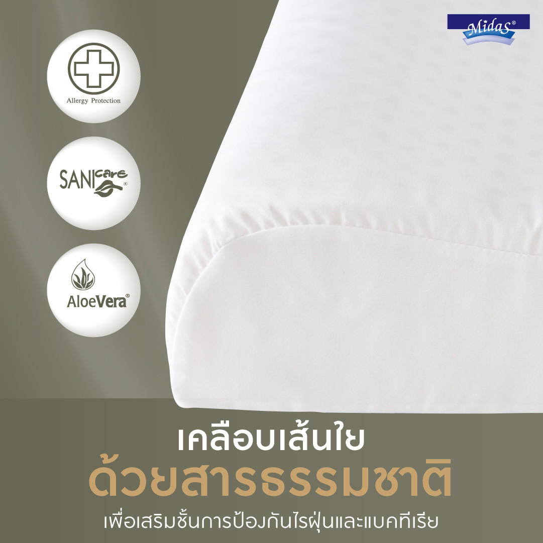 หมอนหนุนยางพารา MIDAS Neck Contour หุ้มด้วยผ้าชนิดพิเศษ ไอบรีซ (I-BreezeTM) สามารถดูดซับและระบายความร้อนของผิวสัมผัส ช่วยปรับสมดุลของอุณหภูมิให้เหมาะสมแก่การนอนหลับ มอบสัมผัสแห่งการพักผ่อนที่สมบูรณ์แบบ